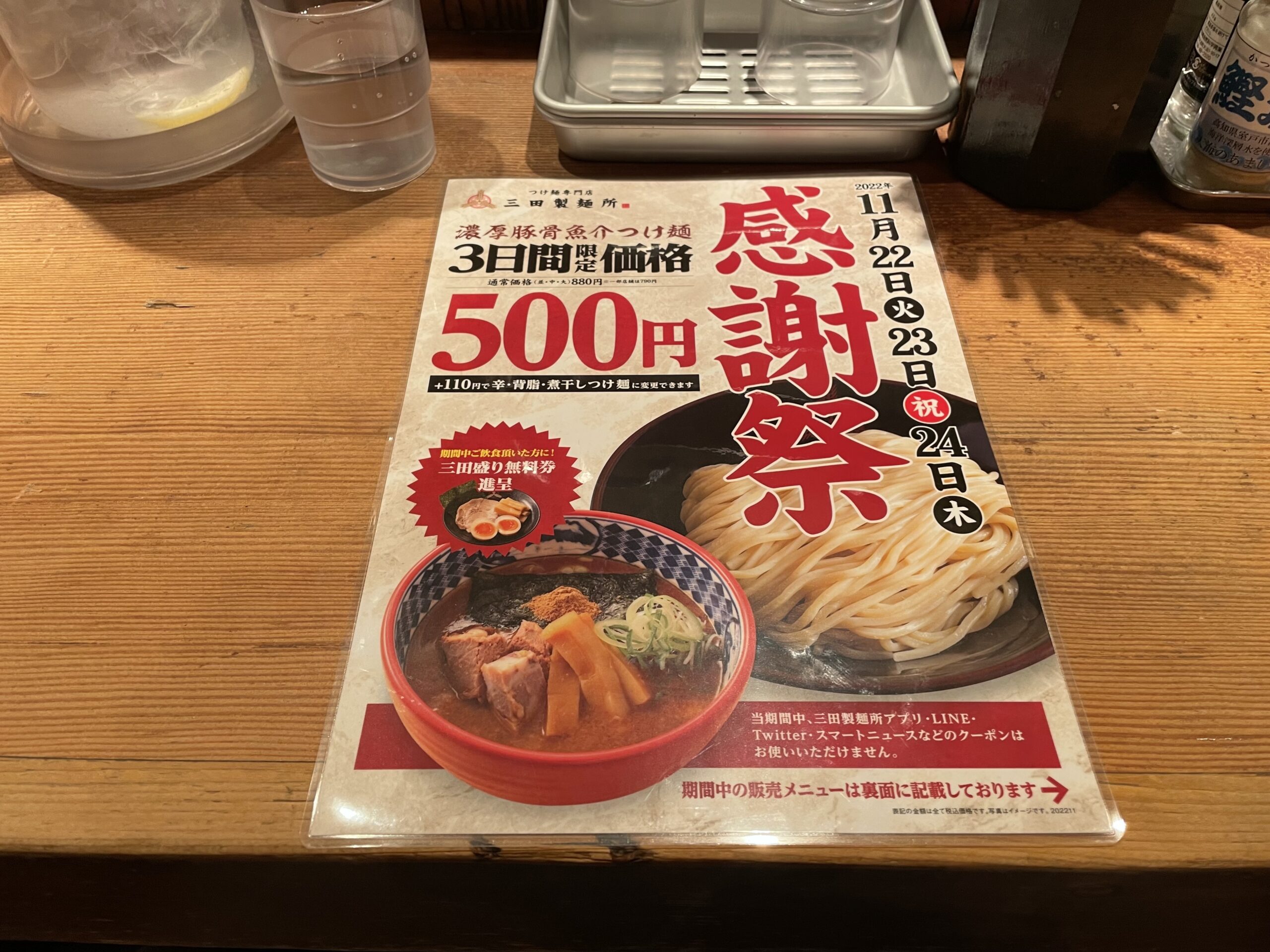 国内、国外あわせて40店舗展開しているつけ麺専門店です。4年ぶりに開催した3日間限定で行われた濃厚豚骨魚介つけ麺が500円でいただける「感謝際」の日でした。